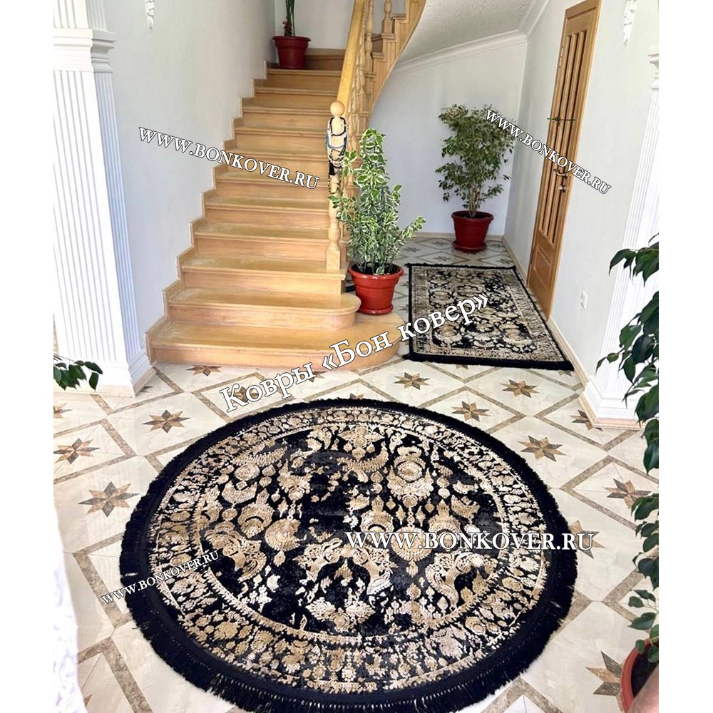 Красивый Современный Турецкий Ковер Дизайн 30665 Черный с Золотым Круг наполняет интерьер квартиры теплом и уютом, гармонично сочетает в себе изящество и стиль. Он изготовлен из высококачественных материалов, комфортный и долговечный.